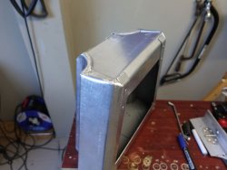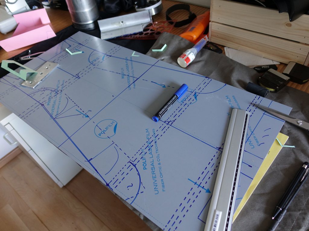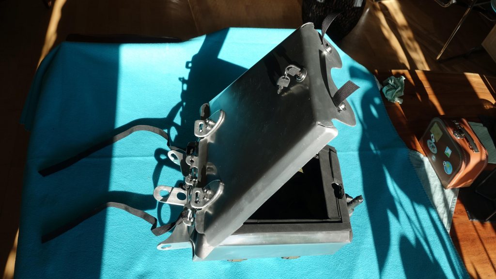 Aus einem Karton wurde eine verbesserte Variante als Muster/Prototyp gefaltet. Die optimale Höhe und Form für das Cargobag wurden damit ermittelt. Auch die seitlich angebrachten Rohre sollten wieder verwendet werden. Anschließend wurde die Abwicklung auf 2mm Aluminiumblech übertragen, ausgesägt und gekantet. Das Topcase erhielt noch einen abschließbaren Deckel der nach vorne aufzuklappen ist und auf dem das Cargobag aufgeschnallt bleibt, auch wenn das Topcase geöffnet wird. Nach unzähligen Arbeitsstunden sieht das Endergenis nun so aus: