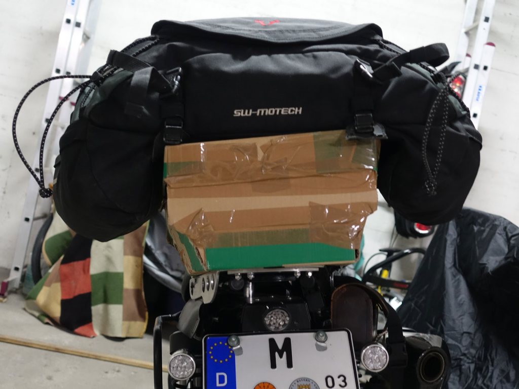 Ein Topcase erhöht den Schwerpunkt und wirkt sich somit nachteilig auf das Fahrverhalten aus. Das ist richtig! Für meine erste Tour ins Piermont zu "Stella Alpina" und zum "Schottern" besorgte ich mir bei Tante Louise die 50 Liter Hecktasche Cargobag von SW-MOTECH. Diese Tasche hat die optimale Größe zum Verstauen von Zelt, Schlafsack, Luma, Campingstuhl und Kleinkram. Sie baut nicht sonderlich hoch und hällt den Schwerpunkt durch die seitlich hängenden Taschen sehr tief. Genau diese hängenden Taschen sind auf meiner Scrambler nachteilig, denn die rechte Seite lag auf dem Endrohr der Auspuffanlage auf. Ein verschmoren der Tasche samt Inhalt wäre unvermeidbar wenn diese nicht höher angebracht würde.